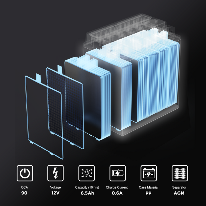 • Motorcycle battery YT7B-BS is a 12V 6.5Ah 90 Cold Cranking Amps (CCA) AGM (Maintenance Free) Battery. Dimensions: 5.91 inches x 2.60 inches x 3.66 inches. Weight: 5.07 Lbs Polarity: [+,-]. Suitable for:YT7B-BS. It has strong low-temperature starting ability and can easily start the vehicle at -22℉.